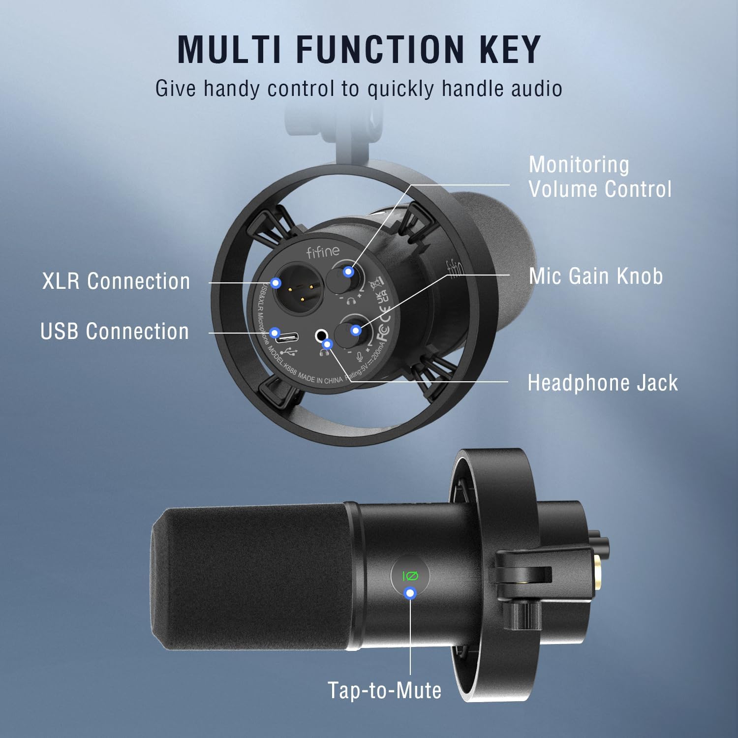 Equipped with a convenient mute tap, the FIFINE K688T allows you to effortlessly control your audio output with a simple touch. The built-in headphone jack enables real-time monitoring, allowing you to fine-tune your audio levels for a professional sound every time.